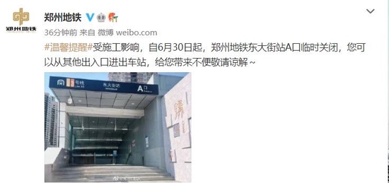 受施工影响 6月30日起 郑州地铁东大街站A口临时关闭