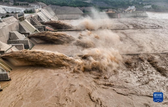 黄河小浪底水库排沙出库(7月4日摄,无人机照片)。新华社发(苗秋闹 摄)