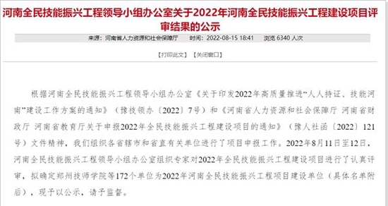 8月24日,河南全民技能振兴工程领导小组办公室发布通知,公布2022年河南全民技能振兴工程建设项目评审结果,拟确定郑州技师学院等172个单位为2022年河南全民技能振兴工程项目建设单位。