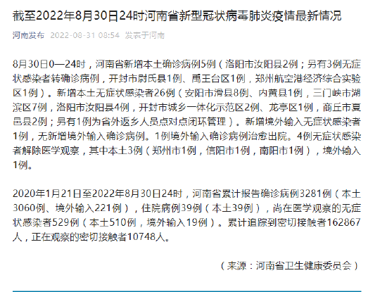 2020年1月21日至2022年8月30日24时,河南省累计报告确诊病例3281例(本土3060例、境外输入221例),住院病例39例(本土39例),尚在医学观察的无症状感染者529例(本土510例,境外输入19例)。累计追踪到密切接触者162867人,正在观察的密切接触者10748人。