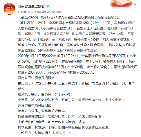 [截至2022年10月12日24时河南省新型冠状病毒肺炎疫情最新情况]10月12日0—24时,全省新增本土确诊病例12例(郑州市12例,其中6例为重点人群筛查发现,6例为隔离管控发现),新增本土无症状感染者23例(开封市3例、郑州市2例、省外返豫人员2例,均为重点人群筛查发现;郑州市4例、平顶山市4例、焦作市2例、三门峡市1例、省外返豫人员5例,均为隔离管控发现)。新增境外输入无症状感染者1例,无新增境外输入确诊病例。1例境外输入确诊病例治愈出院,5例境外输入无症状感染者解除医学观察。