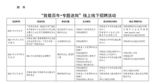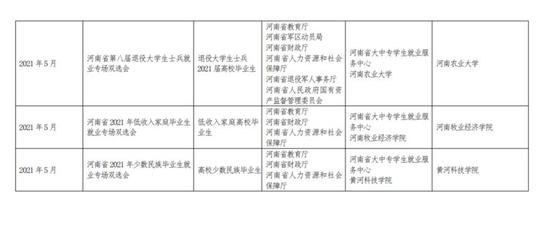 5 月13 日至 19 日的“致敬百年•专题送岗”线上线下招聘交流活动(后附)期间,教育厅将联合 14 个省直部门共同开展“新时代·新梦想”特殊群体毕业生就业公益帮扶行动,举办退役大学生士兵、残疾毕业生、低收入家庭毕业生、少数民族毕业生等就业专场双选会。