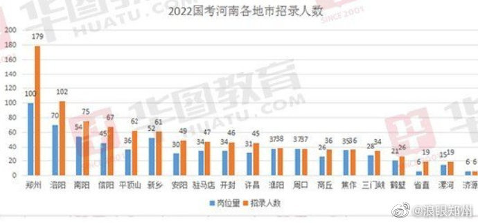 【#2022国考河南招录较去年缩招5%#】2022年国考河南地区招录人数为984人,职位数为697个,较2021年招聘人数减少54人,招录职位减少14个,同比缩招5%。缩招情形下,郑州依然在18个地市中拔得头筹,招录179人,郑州和去年招录相比明显减少,较往年减少28人,其次是洛阳市102人,招录最少的是济源市6人。(河南日报)