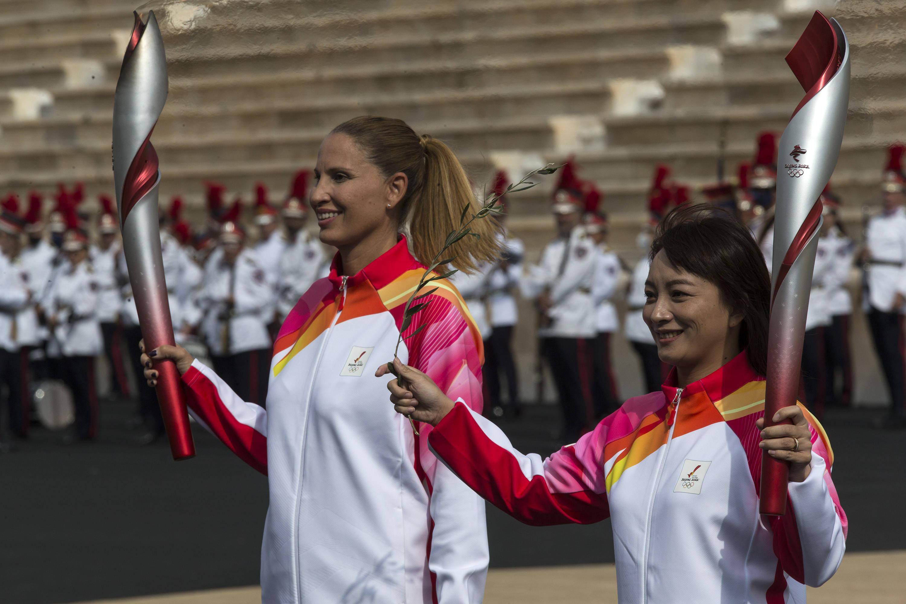 10月19日,场内第一棒火炬手、希腊前水球运动员埃薇·莫赖蒂祖与中国前女子自由式滑雪空中技巧运动员李妮娜(右)进行火炬传递。
