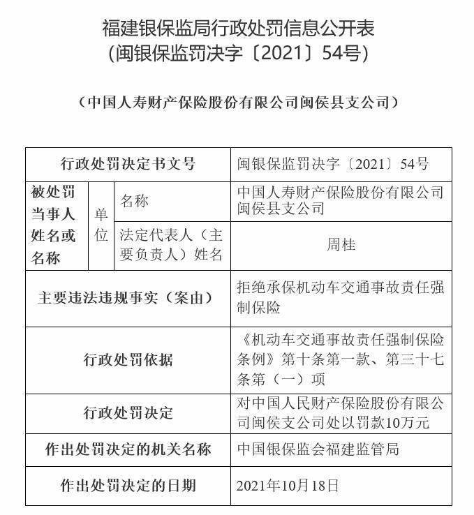 中国经济网北京10月27日讯 银保监会网站今日发布的福建银保监局行政处罚信息公开表(闽银保监罚决字〔2021〕54号)显示,中国人寿财产保险股份有限公司闽侯县支公司拒绝承保机动车交通事故责任强制保险。中国银保监会福建监管局依据《机动车交通事故责任强制保险条例》第十条第一款、第三十七条第(一)项,对中国人民财产保险股份有限公司闽侯支公司处以罚款10万元。