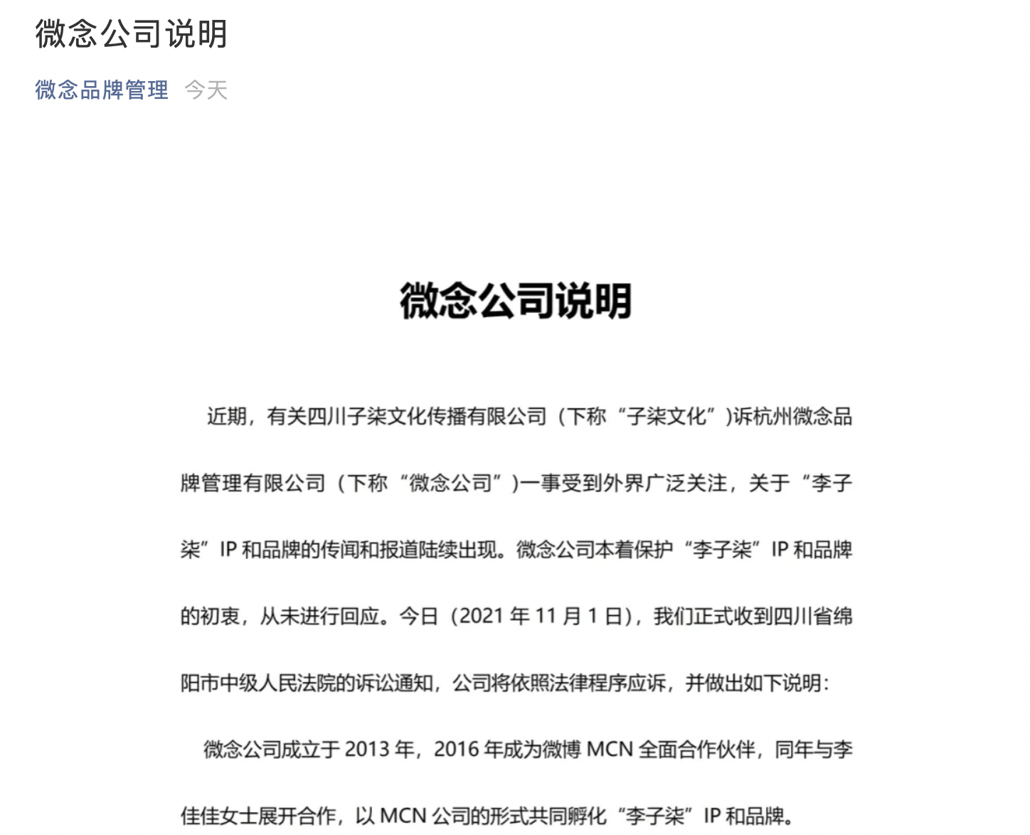 11月1日晚,微念方面发声,称收到四川省绵阳市中级人民法院的诉讼通知,将依照法律程序应诉。同时,在这份说明中,对外界关于“李子柒”IP和品牌的传闻,微念称,2016 年与李佳佳展开合作,以MCN公司的形式共同孵化“李子柒”IP 和品牌。同年,公司创始人刘同明与李佳佳进行深度沟通,最终确立双方合作模式,李佳佳负责内容创作与发布,微念公司负责运营与探索商业模式。“从未干涉过李佳佳的内容创作,也从未想过、从未控制过任何@李子柒的相关平台账号。”