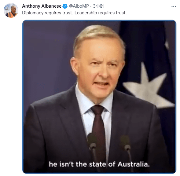 他强调,外交需要信任,领导力需要信任,莫里森“不代表澳大利亚”。