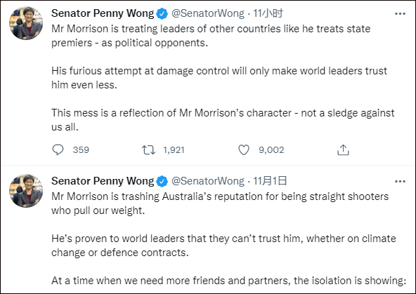 11月1日,澳参议院工党领袖兼反对党领袖、影子内阁外交部长黄英贤(Penny Wong,华裔澳大利亚人)连发多条推文,表示莫里森已经证明自己并不值得被信任。