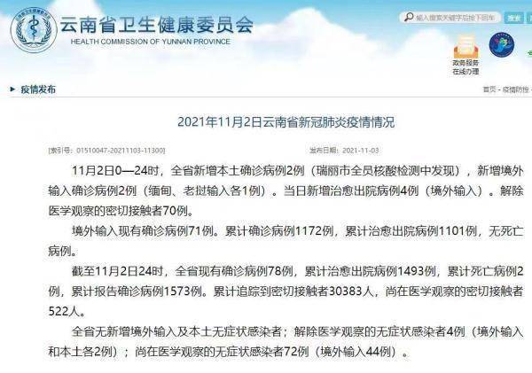 11月2日0—24时,云南新增本土确诊病例2例(瑞丽市全员核酸检测中发现),新增境外输入确诊病例2例(缅甸、老挝输入各1例)。