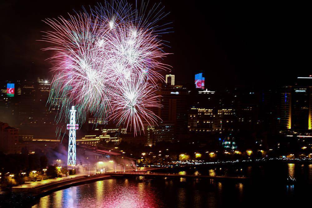 当地时间2021年11月8日,阿塞拜疆巴库,当地燃放烟花,庆祝阿塞拜疆与亚美尼亚间的纳卡战争结束一周年。