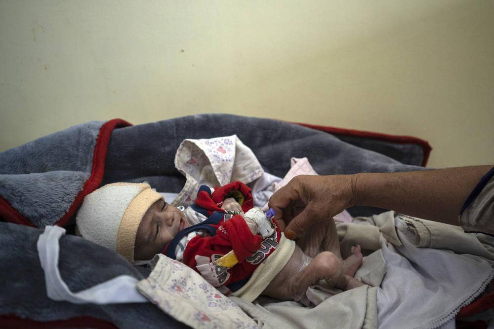 当地时间2021年11月8日,阿富汗喀布尔,因营养不良而住院的婴儿躺在床上。