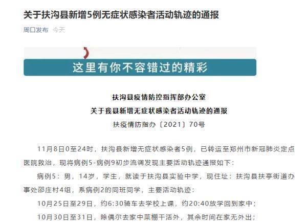 11月8日0至24时,扶沟县新增无症状感染者5例,已转运至郑州市新冠肺炎定点医院救治,现将病例5-病例9初步流调发现主要活动轨迹通报如下:
