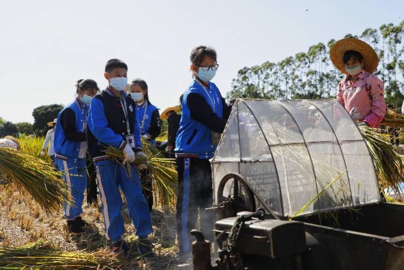 学生参与晚稻收割。