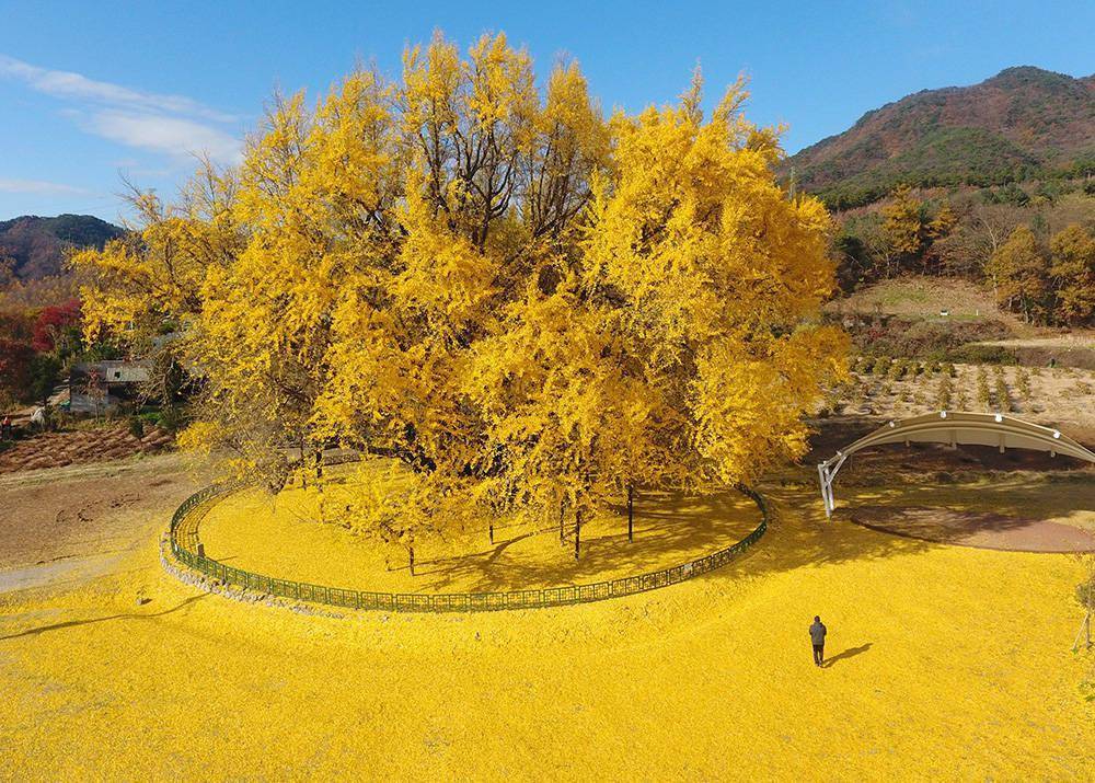 韩国800年古银杏树落叶形成绝美黄“地毯”