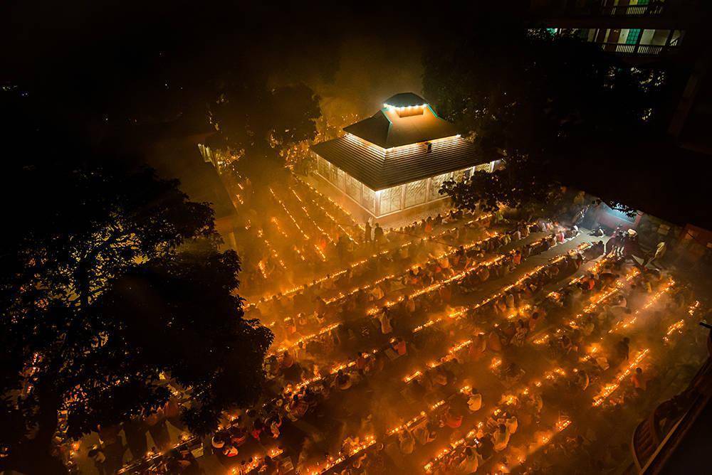 孟加拉国民众庆祝传统节日,围坐寺庙外秉烛祈祷