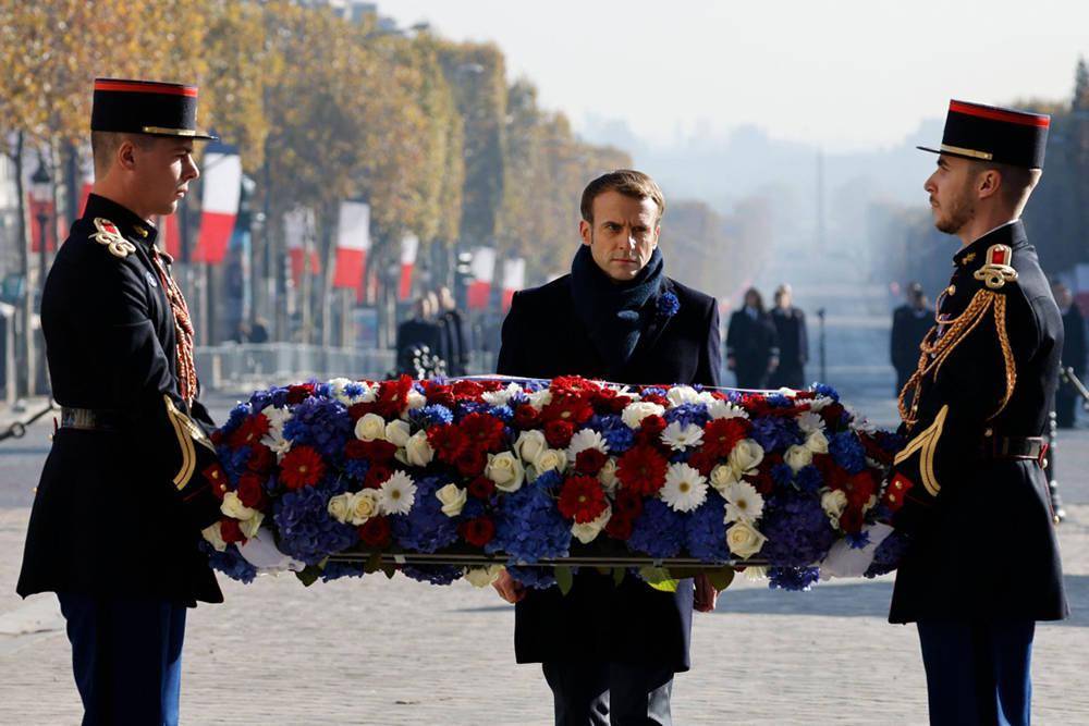 当地时间2021年11月11日,法国总统马克龙(中)在巴黎出席纪念活动。当日,英国、法国举行活动纪念一战结束103周年。
