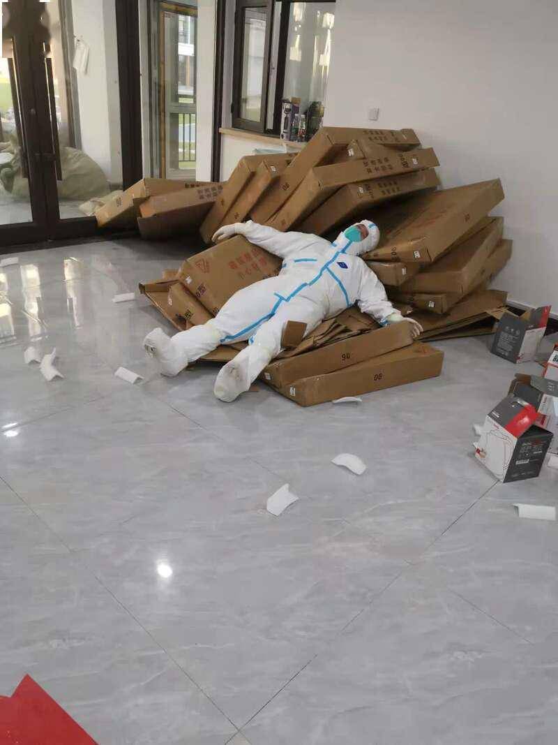 一名志愿者累得倒在地上就睡着了。东大学城志愿者负责人郑心供图