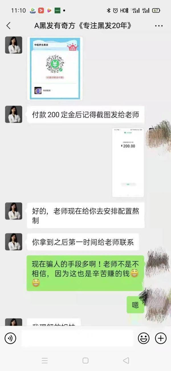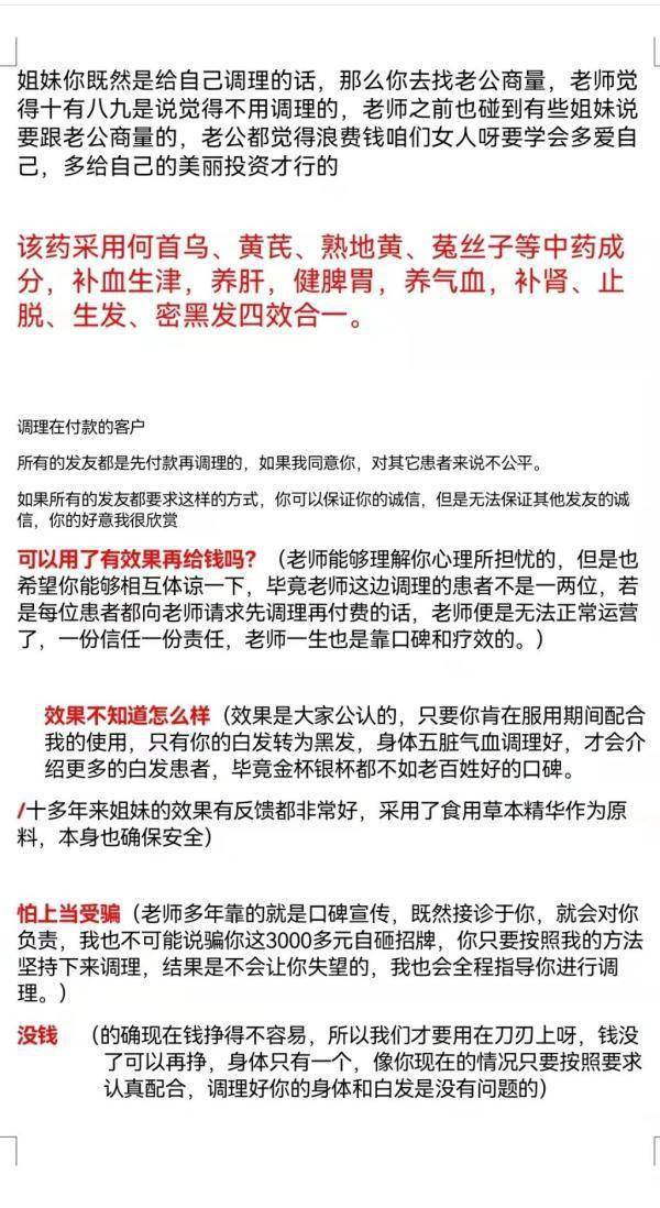 视频中号称:可以花极少的钱让白发转黑,并且60岁前不会再返白。虽然尚未满40岁,但张女士已有不少白发,广告中的承诺不禁让她怦然心动,于是添加了视频中显示的微信号。