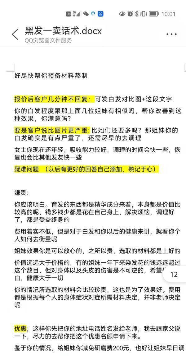 该团伙先通过短视频平台发布广告引流,吸引被害人添加视频中公布的网络社交平台账号。其后,通过专门话术,一步步骗取被害人信任,并引诱其一而再、再而三地以高价网购所谓的养生护发产品。为顺利实施诈骗和获取被害人信任,该团伙还专门设计了诈骗话术本在团伙内部开展培训,并虚构了所谓“毛发健康中心”、伪造了相关体检及鉴定报告。