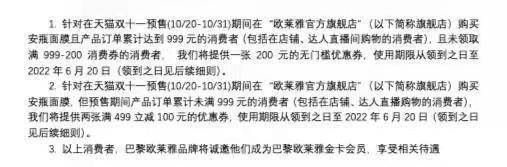 然而在预售结束后,欧莱雅却又发放大量“满999-200元”的优惠券,致使面膜前后差价高达100多元。