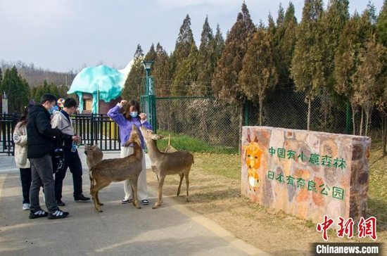 图为郑州新密伏羲山景区里小鹿和游客互动。 新密伏羲山景区供图