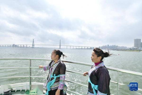 在广东廉江市近海海域的游船上,来自广西融水苗族自治县杆洞乡党鸠村乌英苗寨的妇女梁足英(左)和吴妹富在欣赏海景(11月4日摄)。在廉江市爱心人士的支持下,她们第一次走出大苗山参观学习。