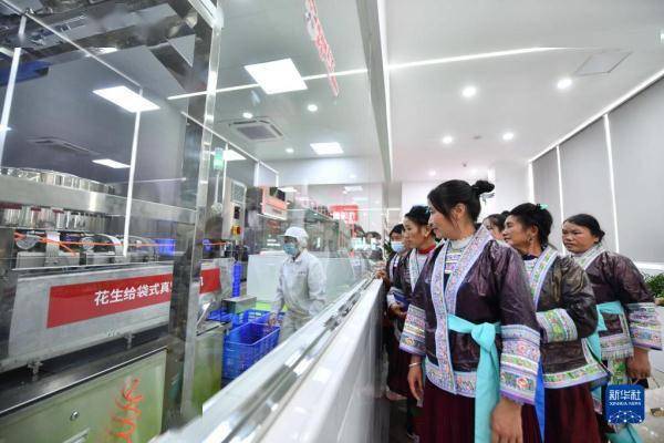 乌英苗寨的妇女们在参观螺蛳粉生产线(10月14日摄)。