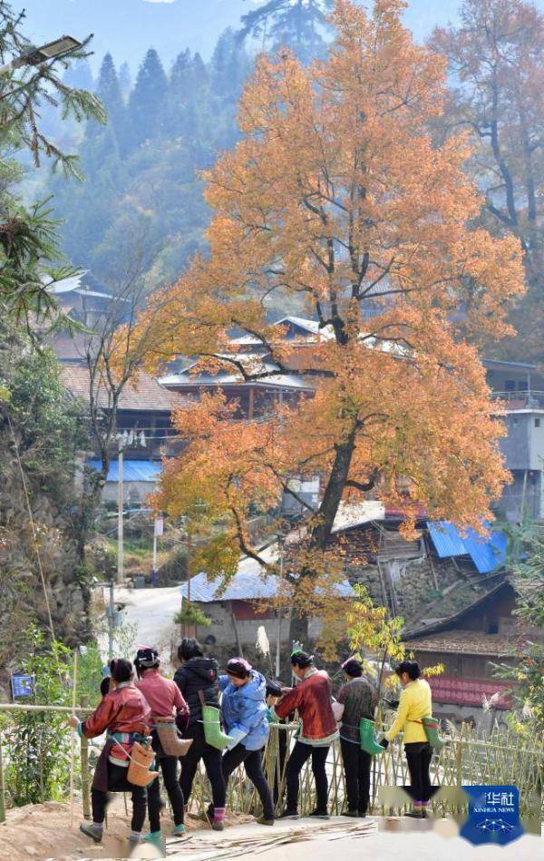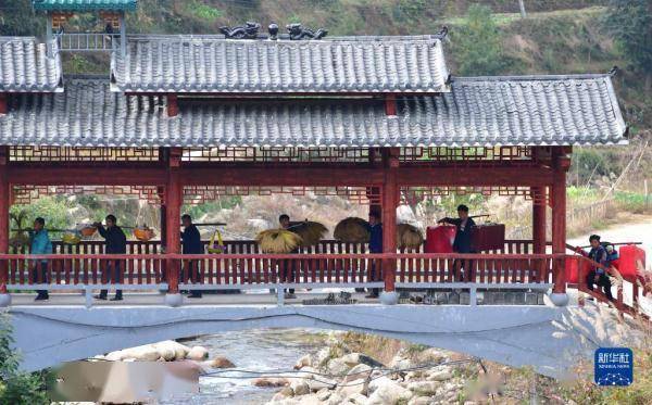 乌英苗寨的村民挑着礼物去参加喜宴(12月14日摄)。