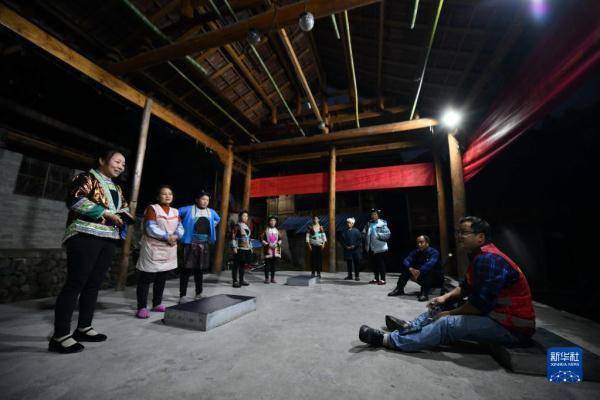 在乌英苗寨,驻村工作队队员覃天阳(左一)和村民在筹备亮布文化节(10月18日摄)。