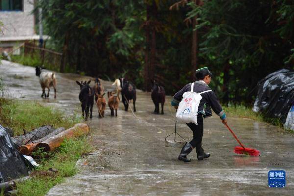 在乌英苗寨,村民代时英一边放羊,一边清扫马路上的羊粪(10月21日摄)。