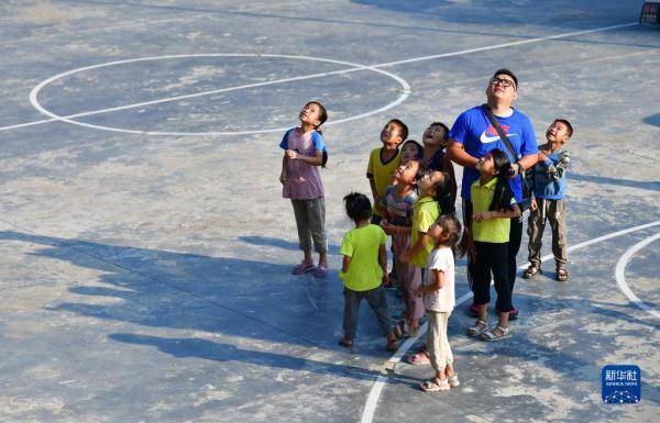 在乌英苗寨,广西柳州市鱼峰区宣传部干部郑昌昊和孩子们在操作无人机(10月2日摄)。郑昌昊曾于2020年4月至2021年5月在乌英苗寨担任驻村工作队队员。