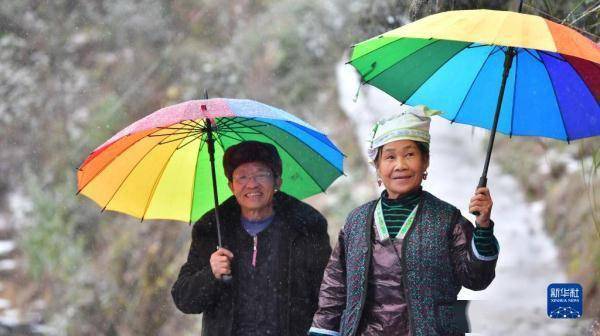 在乌英苗寨,村民梁安合和妻子梁英迷在赏雪(12月26日摄)。