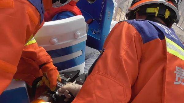 掌握情况后,现场指挥员立即下令让一名消防员用液压扩张钳扩张缝隙缺口,让小男孩被卡部位缝隙扩大,同时尝试是否能够取出,一名消防员在旁协助,其余人员固定机身,防止造成二次伤害。