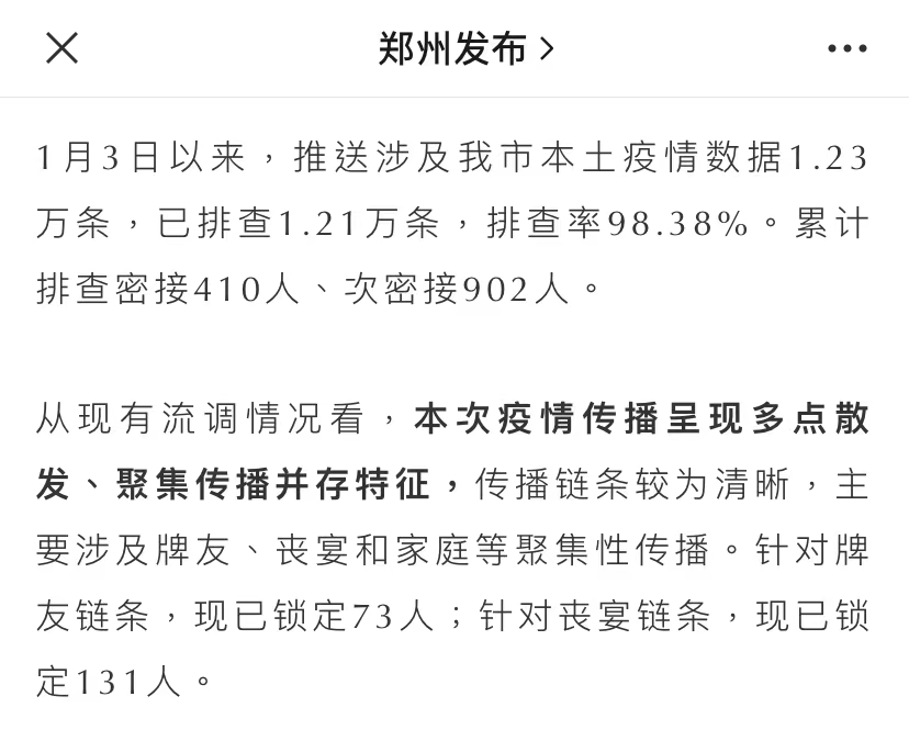 从郑州当地公布的密接个案来看,能分析的轨迹信息有限,涉及牌友、丧宴、家庭等传播链条。