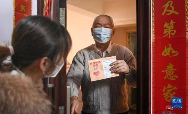 1月7日,西安市未央区一社区工作人员为居家隔离的老人(右)送上“疫情防控明白卡”。