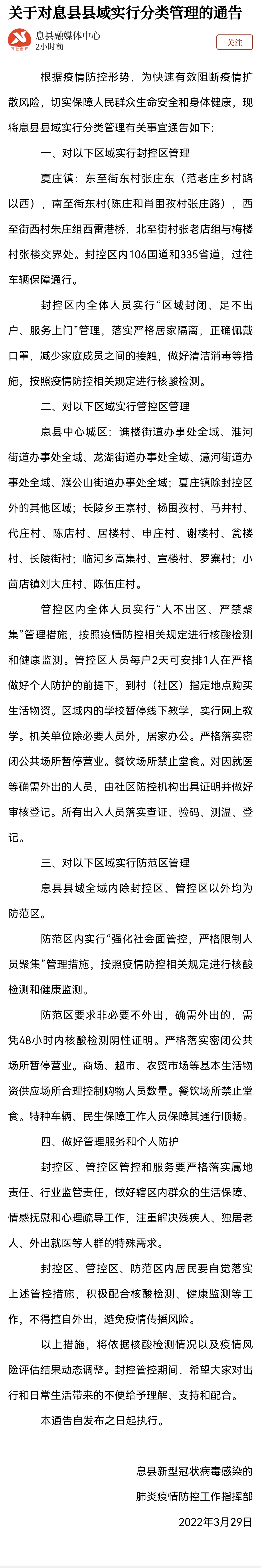 【关于对#息县县域实行分类管理#的通告】根据疫情防控形势,为快速有效阻断疫情扩散风险,切实保障人民群众生命安全和身体健康,现将息县县域实行分类管理有关事宜通告如下: