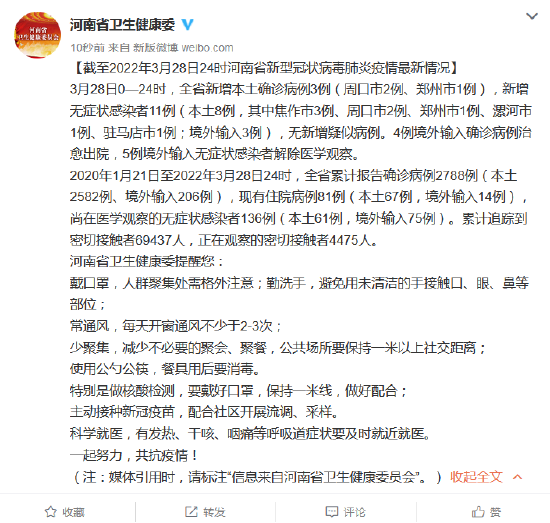 [截至2022年3月28日24时河南省新型冠状病毒肺炎疫情最新情况]