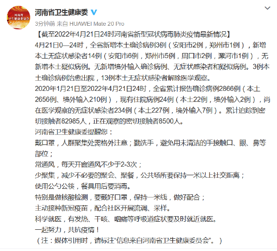 4月21日0—24时,全省新增本土确诊病例3例(安阳市2例,郑州市1例),新增本土无症状感染者14例(安阳市6例,郑州市5例,周口市2例,漯河市1例),无新增本土疑似病例。无新增境外输入确诊病例、无症状感染者和疑似病例。3例本土确诊病例治愈出院,13例本土无症状感染者解除医学观察。