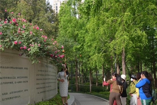据悉,为迎接郑州市第二十八届月季花展,月季公园还精心筹备,通过沿路打造别出心裁的景观小品,营造优美的游园环境。