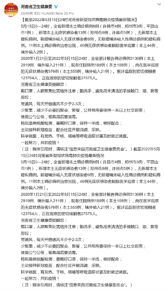 5月15日0—24时,全省新增本土确诊病例8例(许昌市4例,郑州市3例,平顶山市1例),新增本土无症状感染者13例(郑州市8例,许昌市5例),无新增本土疑似病例。新增境外输入无症状感染者6例,无新增境外输入性确诊病例和疑似病例。11例本土确诊病例治愈出院,46例无症状感染者解除医学观察(本土44例,境外输入2例)。
