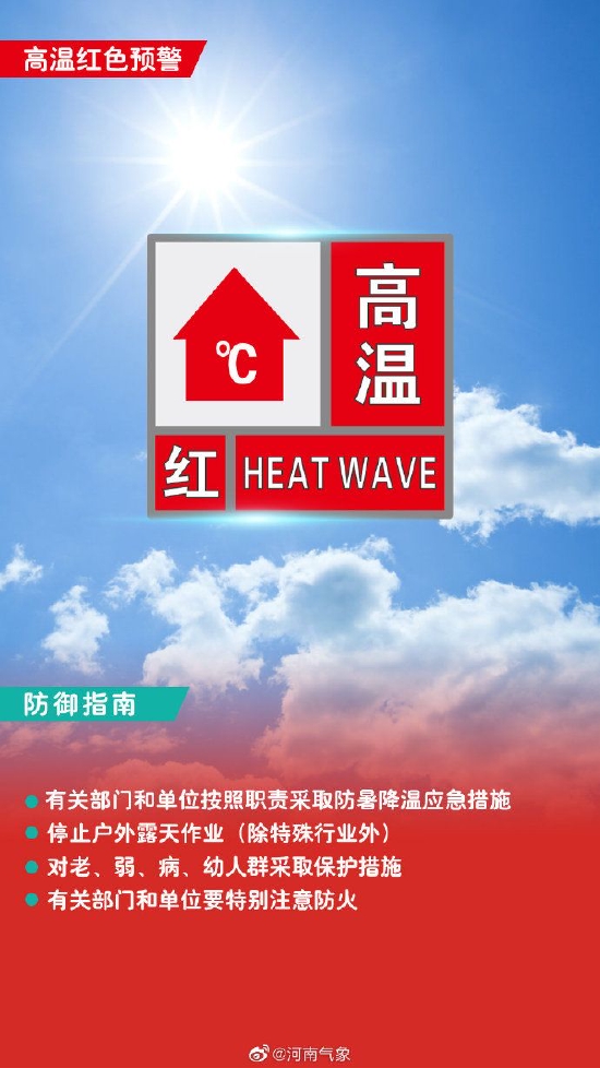 郑州市气象台2022年06月18日07时20分继续发布高温红色预警信号:预计今天白天郑州市主城区、航空港区、上街区最高气温将升至40℃以上,请注意防范高温天气带来的不利影响。