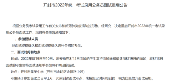 河南省2022年统一考试录用公务员面试工作8月2日至5日在各地开展。受疫情影响,开封考区所有职位面试以及商丘、信阳两地部分职位面试延期进行。