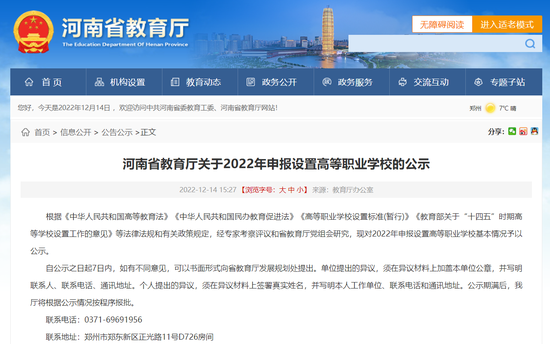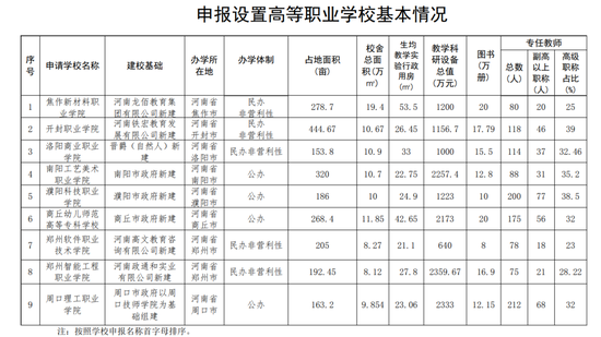 根据《中华人民共和国高等教育法》《中华人民共和国民办教育促进法》《高等职业学校设置标准(暂行)》《教育部关于“十四五”时期高等学校设置工作的意见》等法律法规和有关政策规定,经专家考察评议和省教育厅党组会研究,现对2022年申报设置高等职业学校基本情况予以公示。