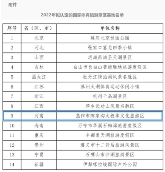12月2日,体育总局办公厅、文化和旅游部办公厅联合发布通知,公示2022年国家体育旅游示范基地名单,全国共14家单位入选。其中,焦作市陈家沟太极拳文化旅游区是河南省唯一上榜的。公示时间为12月2日至12月8日。