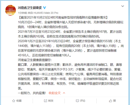 10月23日0—24时,全省新增境外输入无症状感染者1例,无新增确诊病例和疑似病例,1例境外输入确诊病例治愈出院。