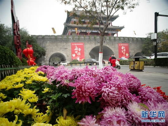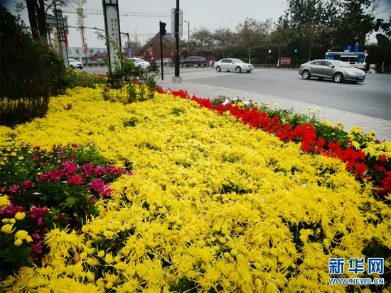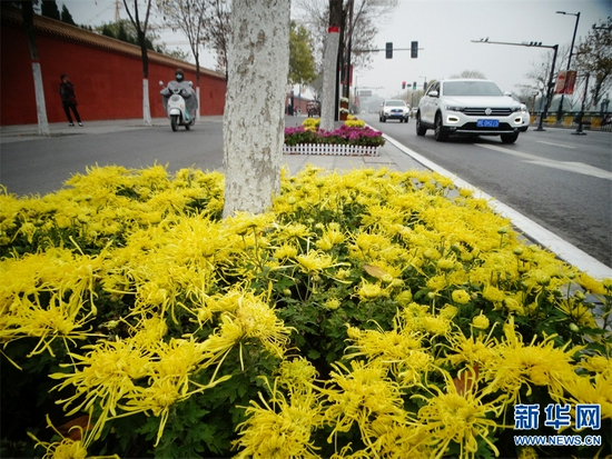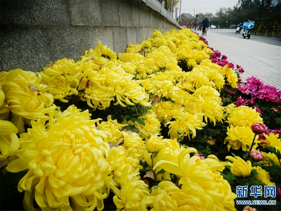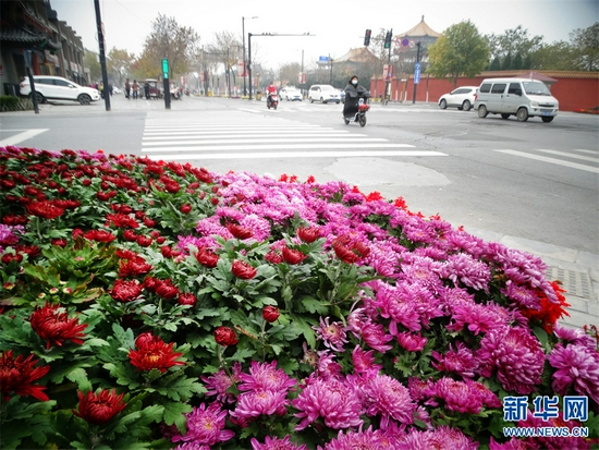 晚秋时节,河南省开封市街头摆放的菊花在寒风中依然绽放,花色更加娇艳迷人。新华网发(李俊生 摄)