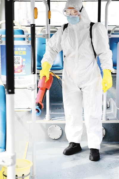 在郑州公交各个场站,车长身穿防护服,背着消毒液,对每一辆公交车进行认真细致的消毒。“我们每趟车都会对运营车辆进行消毒、通风,对每一个扶手以及座位进行擦拭,并且把空调滤网拆掉,认真消毒,让乘客坐上安心车、放心车。”203路党员车长虎萍说。