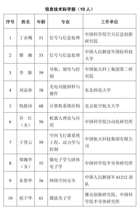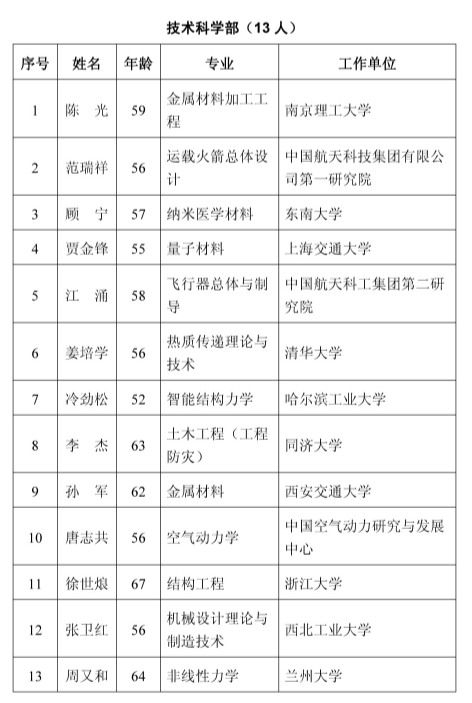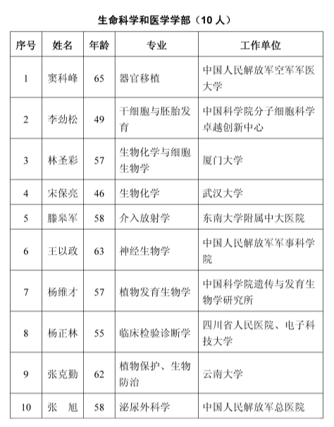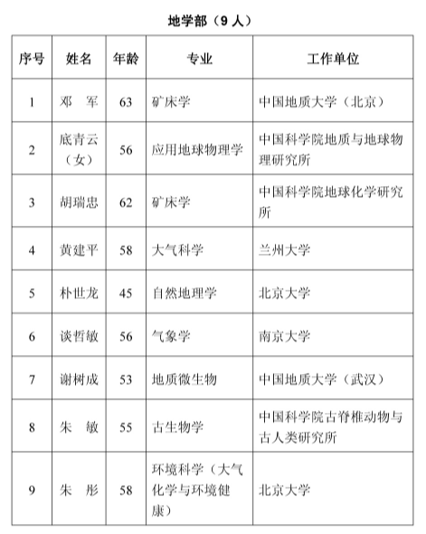 新当选的65位中国科学院院士中,共有女性科学家5人。在新当选院士中,数学物理学部12人,化学部11人,生命科学和医学学部10人,地学部9人,信息技术科学部10人,技术科学部13人。新当选院士平均年龄57.4岁,最小年龄45岁,最大年龄68岁,60岁(含)以下的占76.9%。院士队伍结构得到进一步优化,特别是通过特别推荐评审机制,国防和国家安全领域有5人当选,新兴和交叉学科领域有3人当选。
