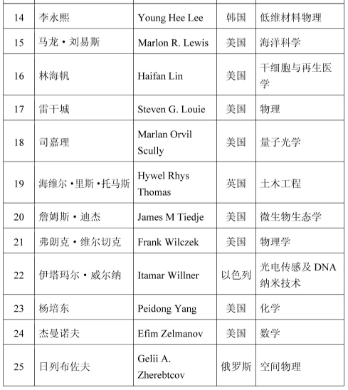 2021年中国科学院新当选外籍院士25人,分别来自11个国家,韩国和瑞士首次有科学家当选中国科学院外籍院士。