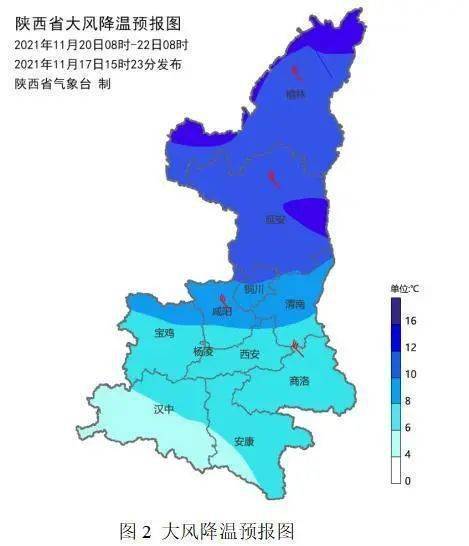 21日陕北有寒潮,日平均气温下降8~10℃,局地10℃以上,关中北部有较强降温,日平均气温下降6~8℃,关中南部、陕南下降4~6℃;22日关中、陕南仍有4℃左右的降温。最低温度22日凌晨陕北降至-12~-8℃,其中榆林北部局地降至-14℃左右,关中、商洛降至-8~-5℃,23日凌晨汉中、安康降至-3~0℃;23日白天气温开始回升。